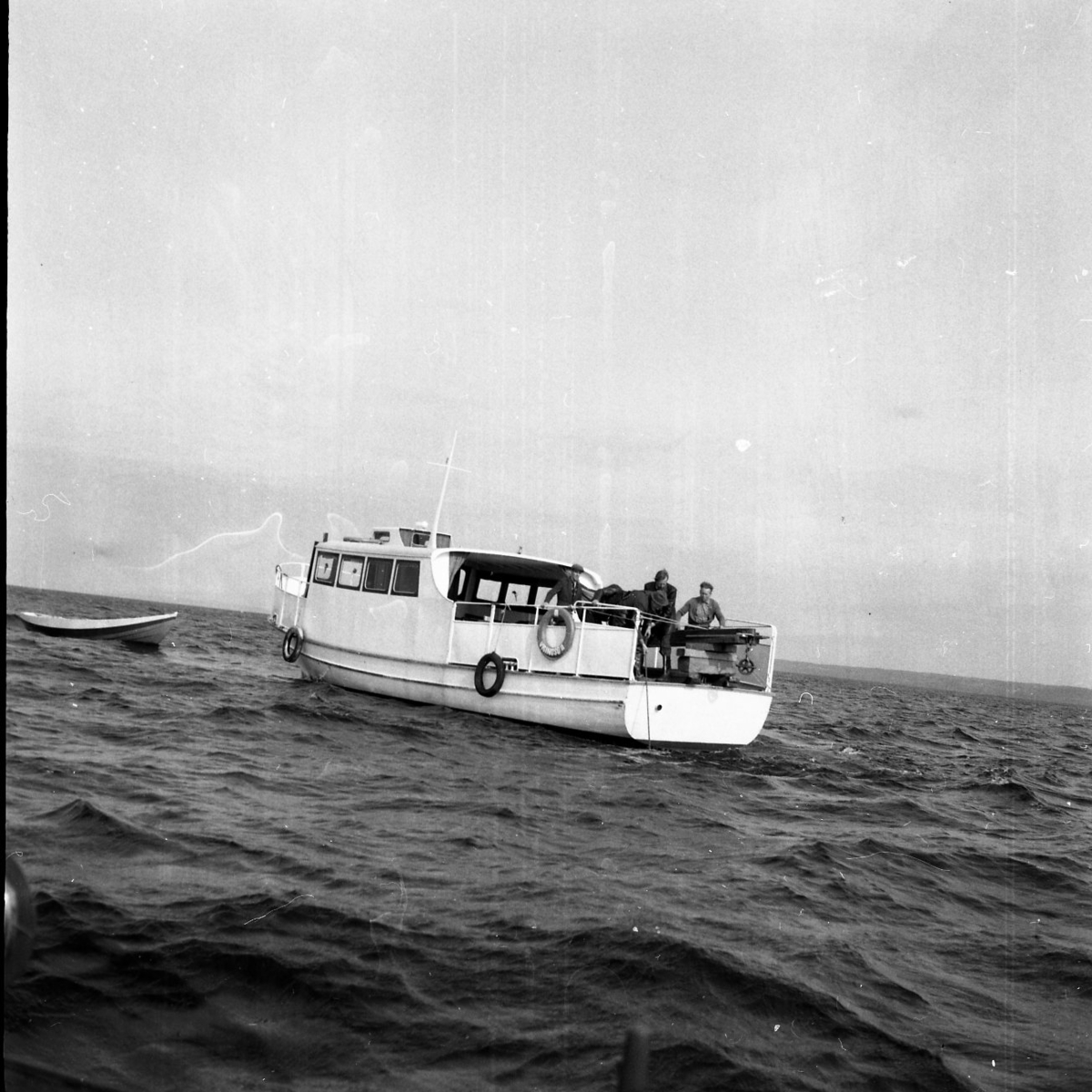 Flera personer står på fartyget m/s Visingsö. En person halar upp ett rep från sjön.