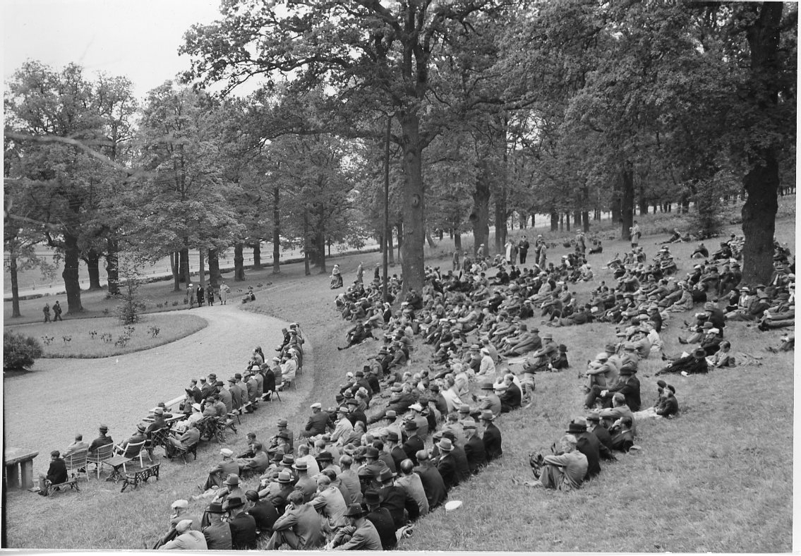 En folksamling sitter i en gränsslänt i anslutning till Vretaholms herrgård.