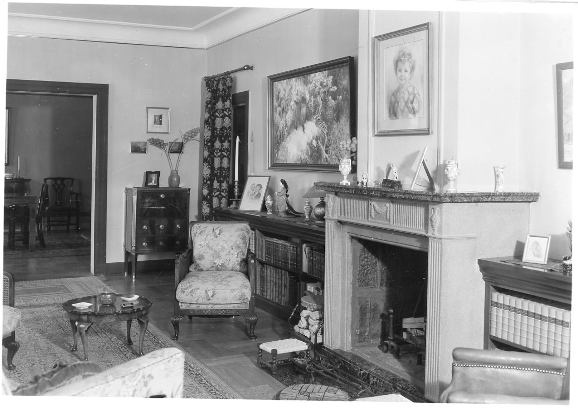 Interiör från ett okänt hem. Stor öppen spis med dekor, porträtt av ett barn ovanför densamma. Stor oljemålning med en räv i ett vinterlandskap.