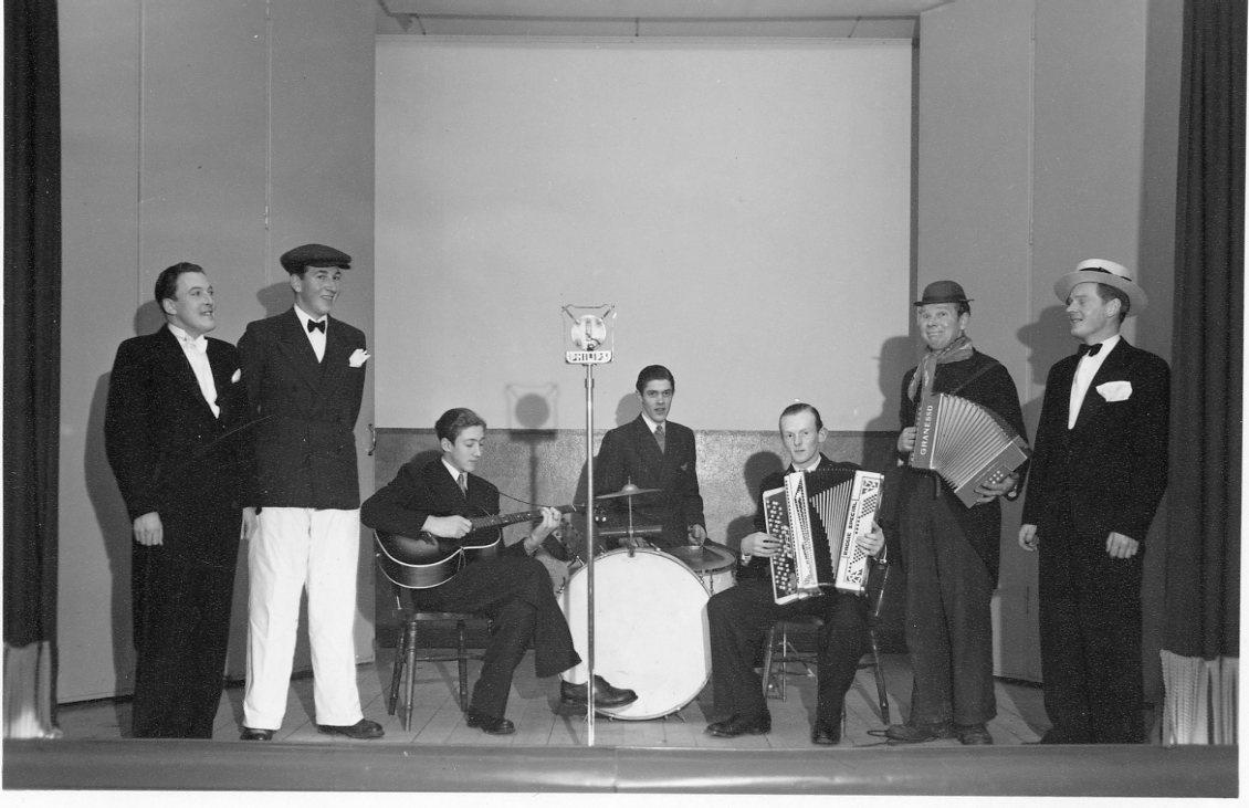 "Grännaamatörerna" på en scen i Gränna, med bland annat en kvartett med musikinstrument.