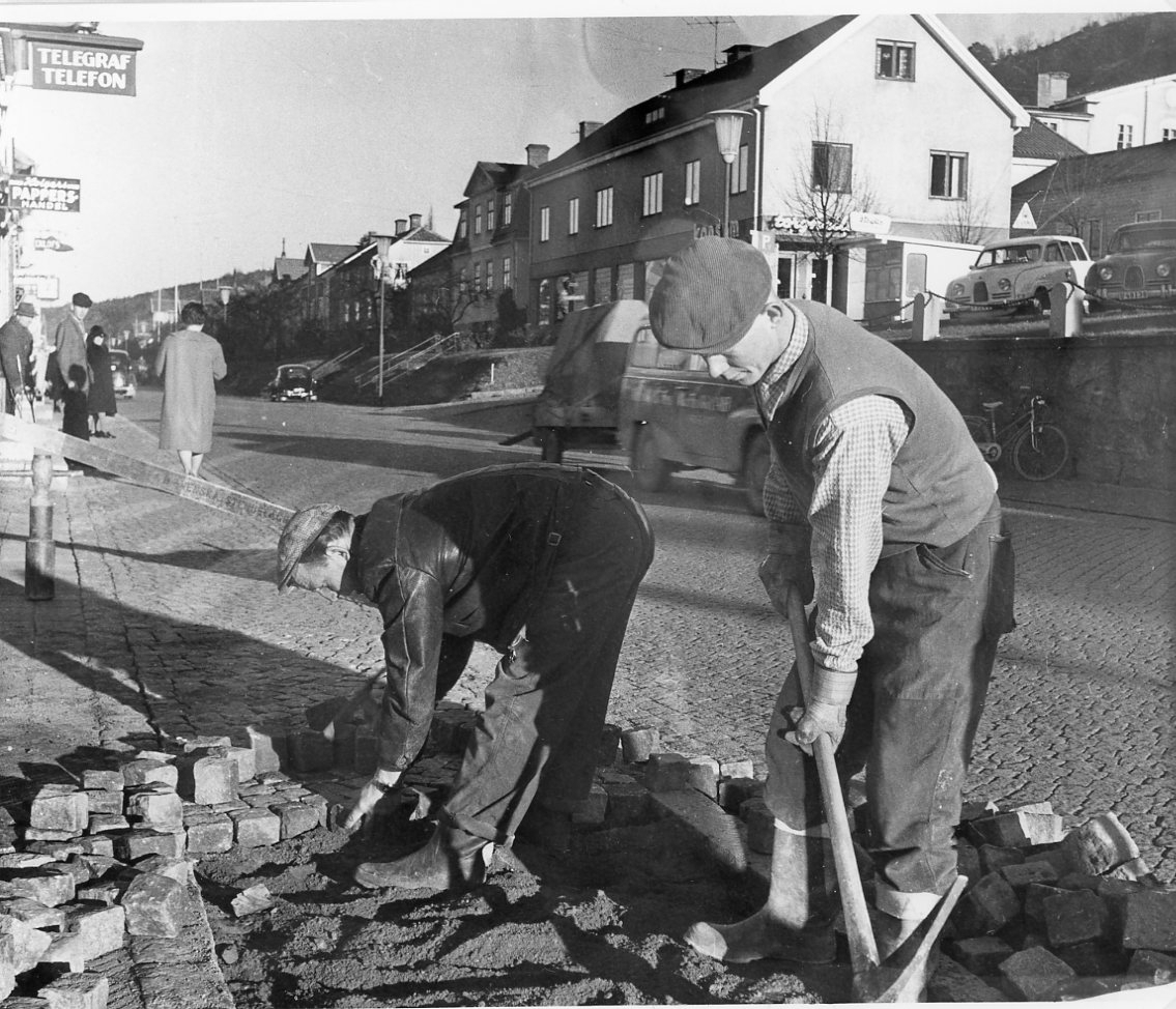 Två män arbetar med stensättning av smågatsten på Brahegatan i Gränna, nedanför torget. Fastigheten till vänster skyltar med Telegraf Telefon, Holgers Pappershandel samt Eklöfs skor.