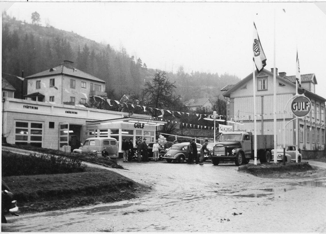 Invigning av GULF-station strax innanför Norrtull i Gränna. Vimplar, ballonger och banderoll med "Välkommen"