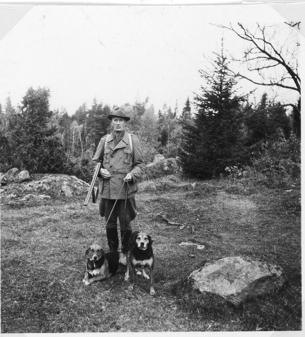 En jägare med två hundar i koppel och en dubbelbössa under armen.