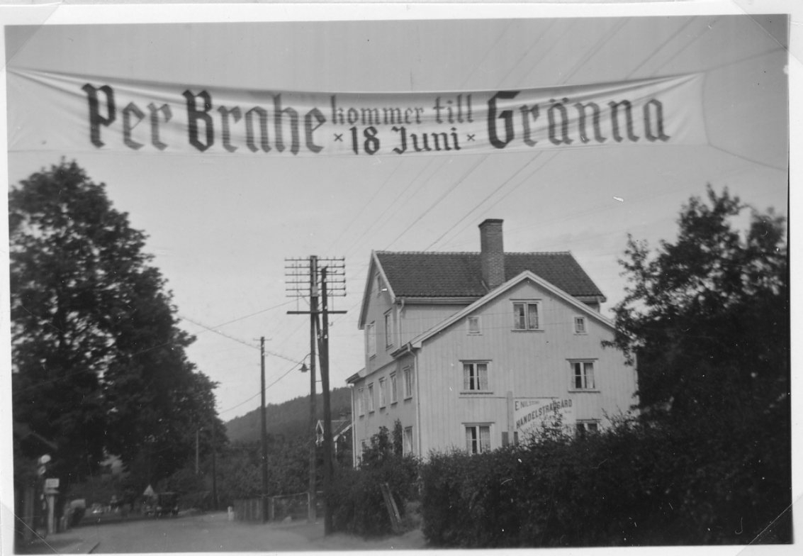 En banderoll - "Per Brahe kommer till Gränna 18 juni" hänger över Brahegatan vid Norrtull. Till höger en skylt för "E Nilssons Handelsträdgård".