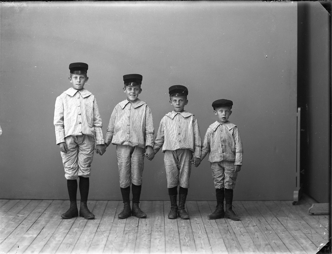 Fyra pojkar i olika åldrar och längd står på ett led vända mot fotografen, alla med randiga kläder och keps på huvudet.