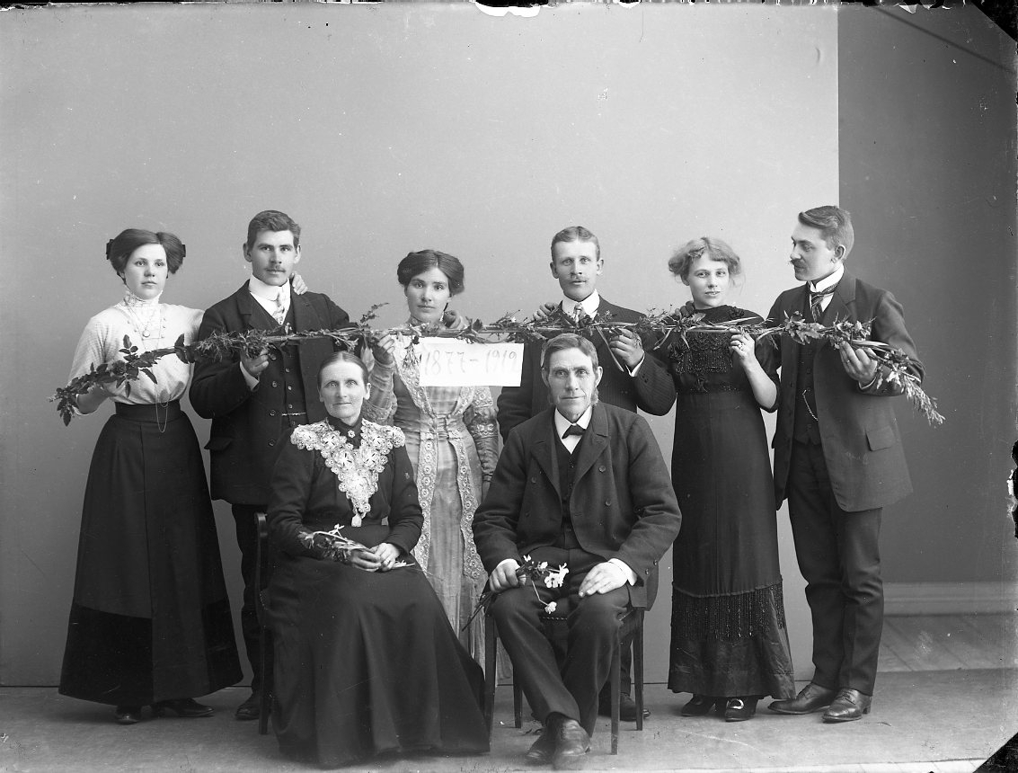 Ett äldre par sitter framför sex män och kvinnor som håller en lång pinne med flätade kvistar och en lapp med texten "1877-1912". Det äldre paret firar 35-årig bröllopsdag.