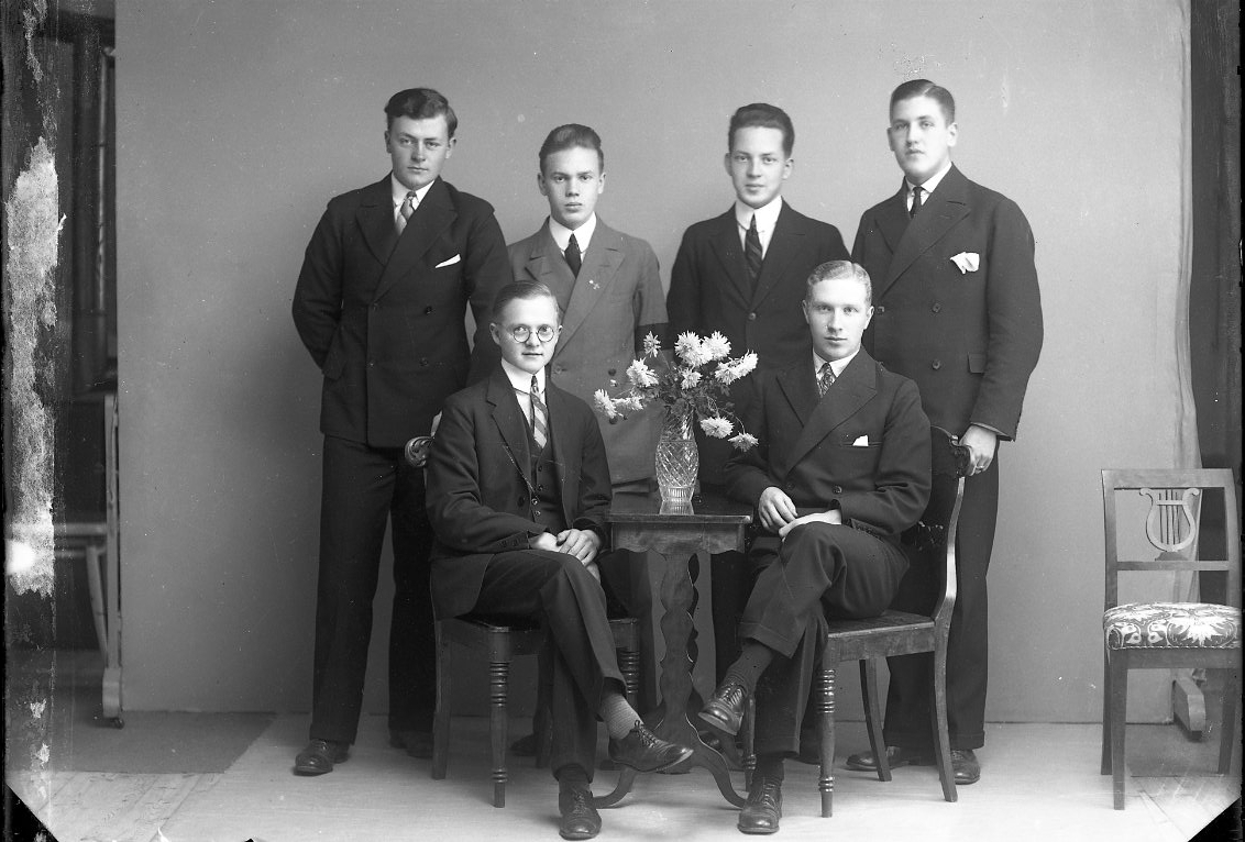 Gruppbild med sex unga män; två sittande framför fyra stående.
