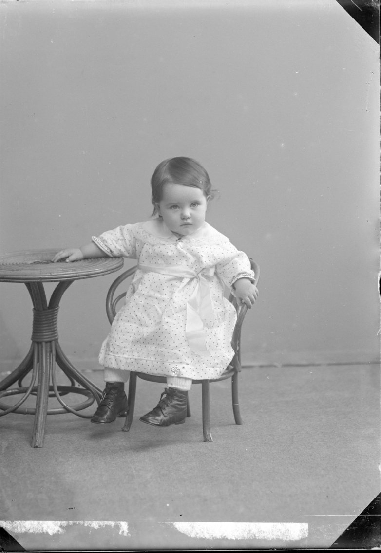 Porträtt av en liten flicka i prickig klänning som sitter i en barnmöbel.