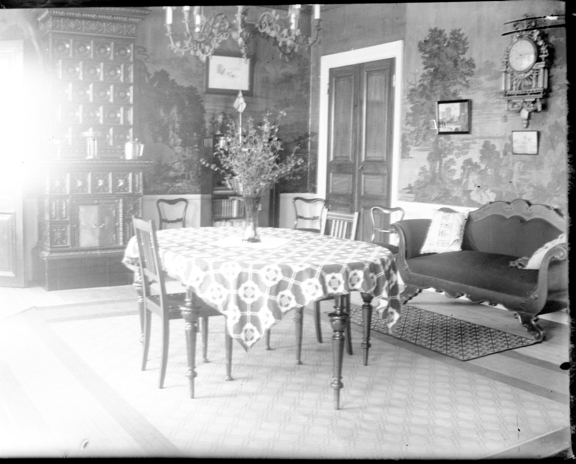 En hemmiljö med stolar runt dukklätt bord under en ljuskrona. Stor kakelugn med profilerat kakel, väggur, panoramatapet med skogsmotiv.