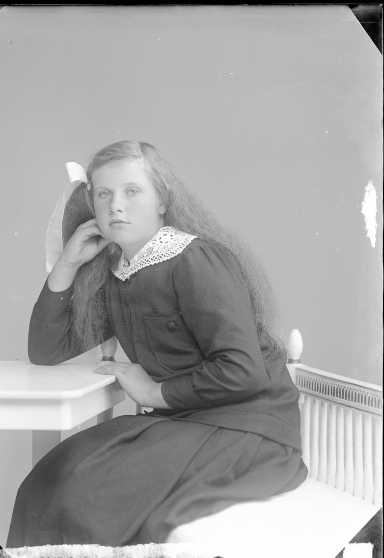 En flicka i mörk klänning, med rosett i långt hår, sitter i en soffa och lutar sig mot ett bord.