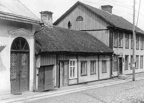 Fastigheter utmed Brahegatan i Gränna. I den bortre (norra) ligger "G. A. Bengtsson Sko-affär".