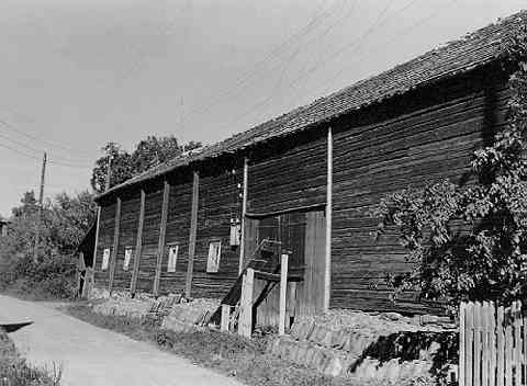 En större ladugård med nedplockat taktegel som ligger på marken mot väggen.