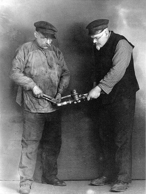 Två män i arbetskläder med rörtänger och arbetsstycke, i en ateljé.