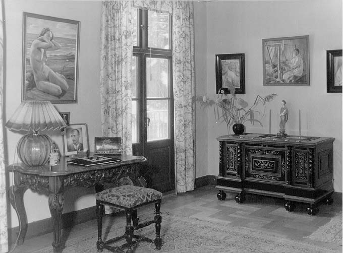 Interiör av ett hem med stilmöbler i Gränna socken. Målning av en naken kvinna på väggen ovanför ett bord
