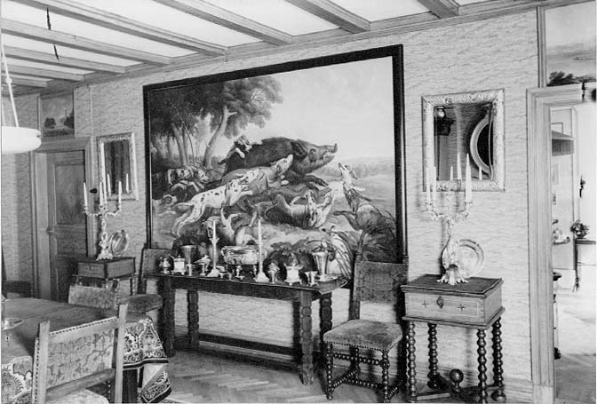 Interiör från ett hem med en stor målning - ett jaktmotiv - på väggen.