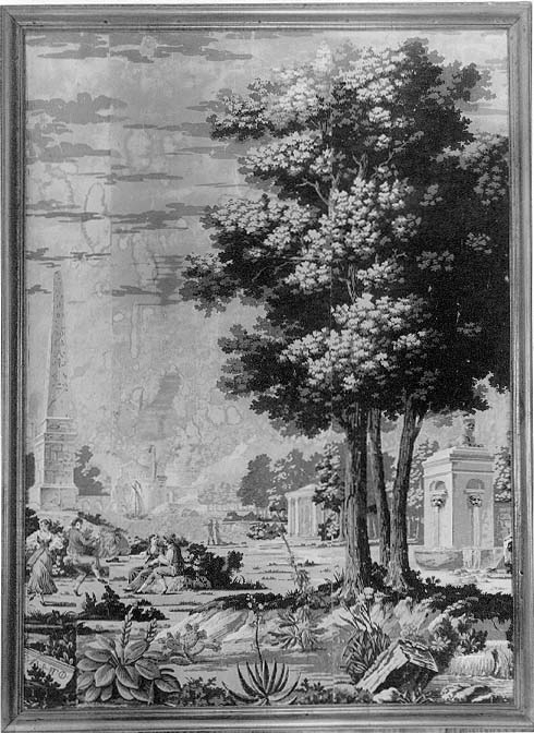 Fotografi av en inramad tapet - antikt motiv - från trädgårdsmästarens bostad i Borgmästargården i Gränna.