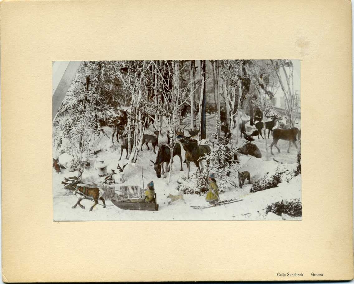 Fotografi av Fredrik Hård af Segerstads diorama med skulpterade figurer från livet på landet i Reaby: "Biologi i skulptur". I dioramat syns bland annat hästar, fåglar och fjäderfä. Färglagt fotografi.