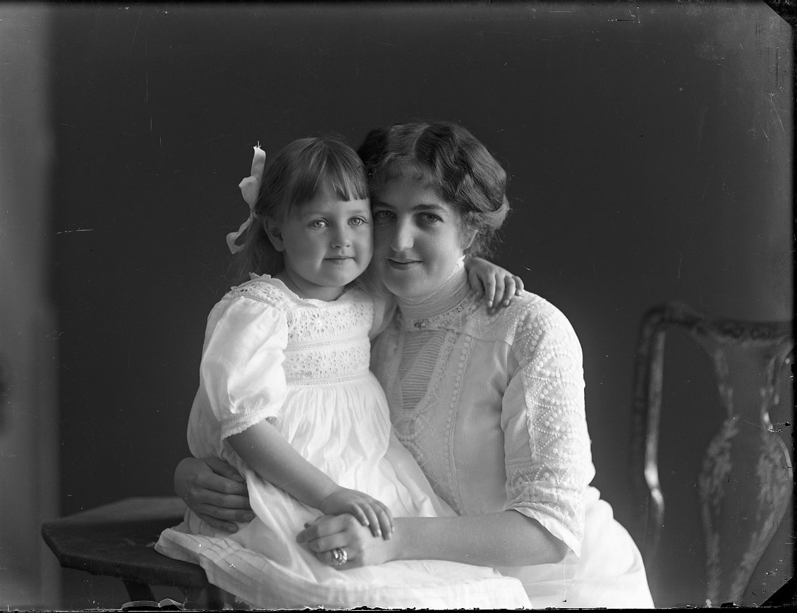 En kvinna med en liten flicka tätt intill sig. Flickan sitter på ett bord.