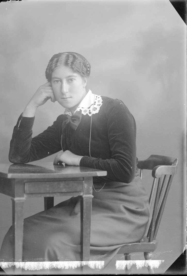 Porträtt av en kvinna i mörk klänning med vit spetskrage och rosett vid halslinningen. Hon sitter vid ett bord och lutar huvudet mot höger hand.
