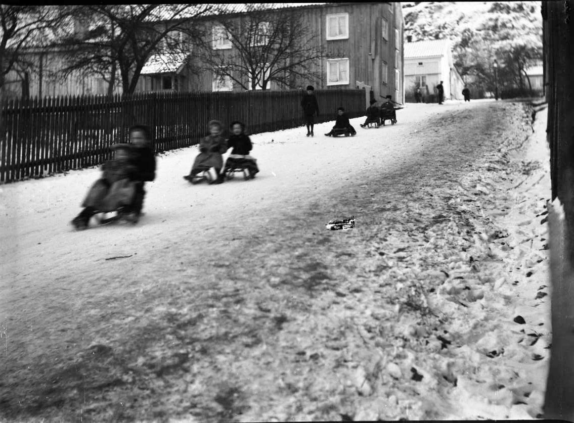 Barn åker kälke på Hahngränd i Gränna.