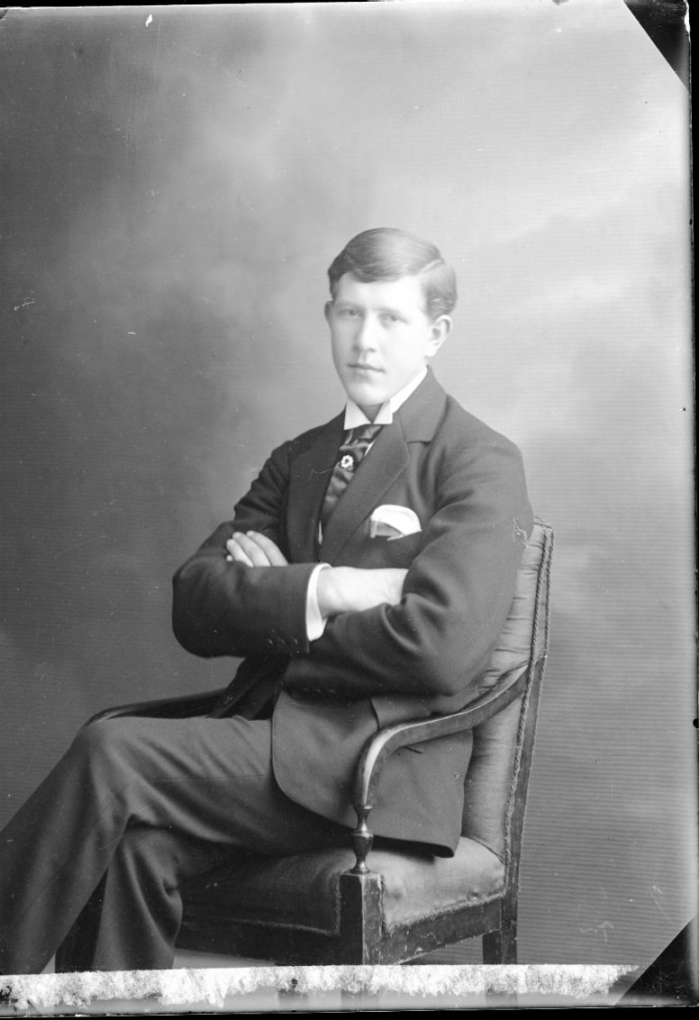 En ung man sitter i en fåtölj med armarna i kors. Slipsnål i form av en blomma.