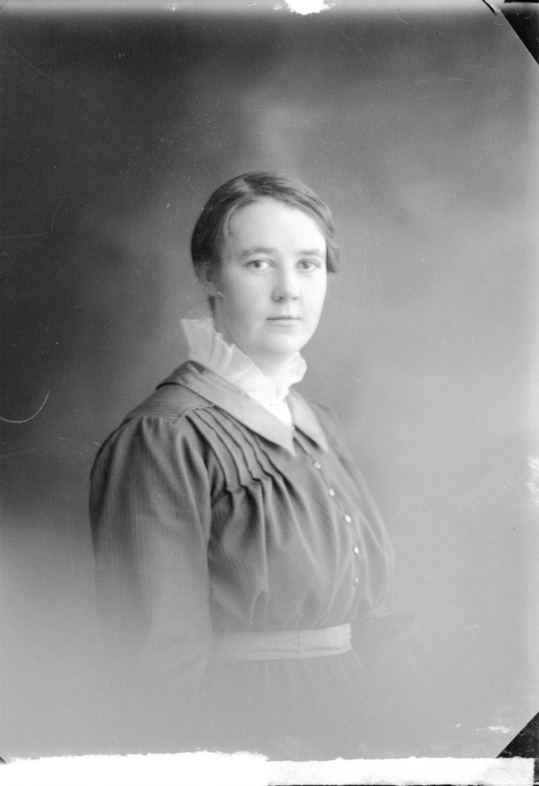 Porträtt av en ung kvinna från sidan, hon vänder huvudet mot fotografen.