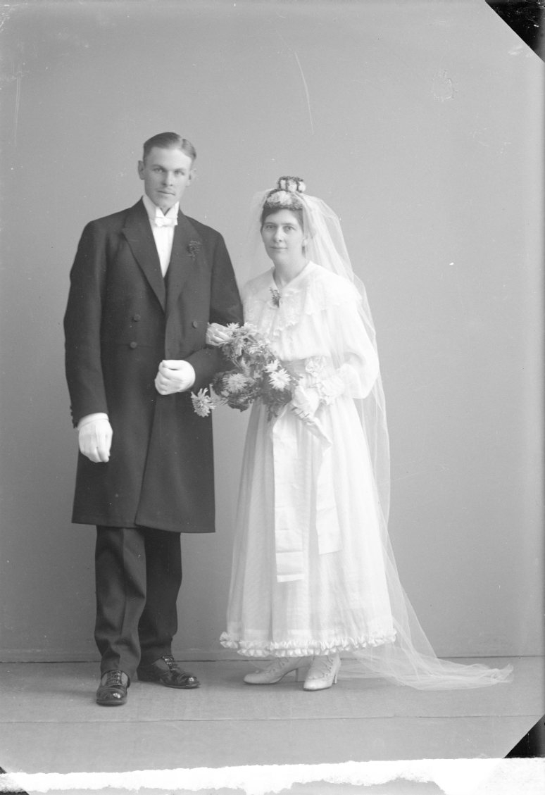 Ett brudpar, bruden i vitt med bukett i handen.