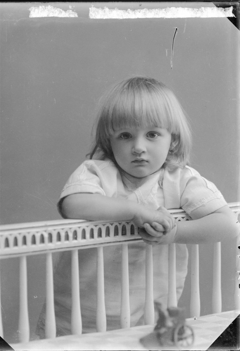 Porträtt av en liten pojke som står lutad mot en soffrygg. På soffan ligger en leksak.