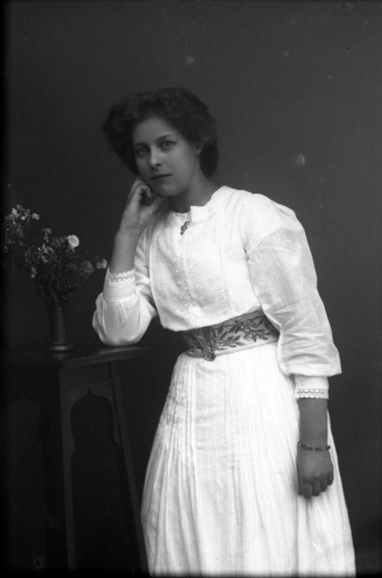 Porträtt av en ung kvinna i ljus klänning som står lutad mot en piedestal med blomvas.
