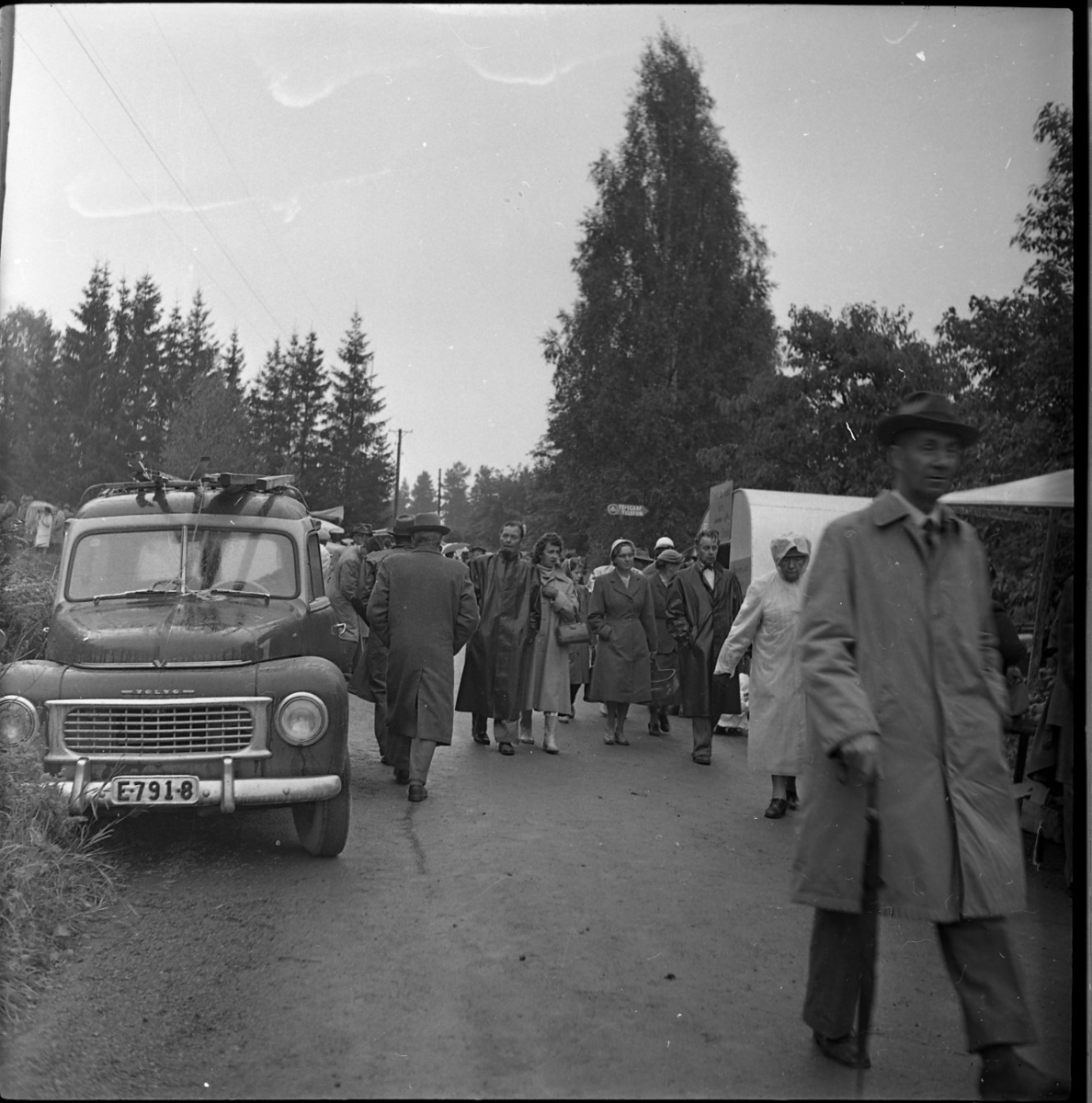 Fullt med människor på en gata, några bär regnkläder. Längst med gatan på höger sida står flera marknadsstånd, på vänster sida står en Volvo PV parkerad med re nr E7918.