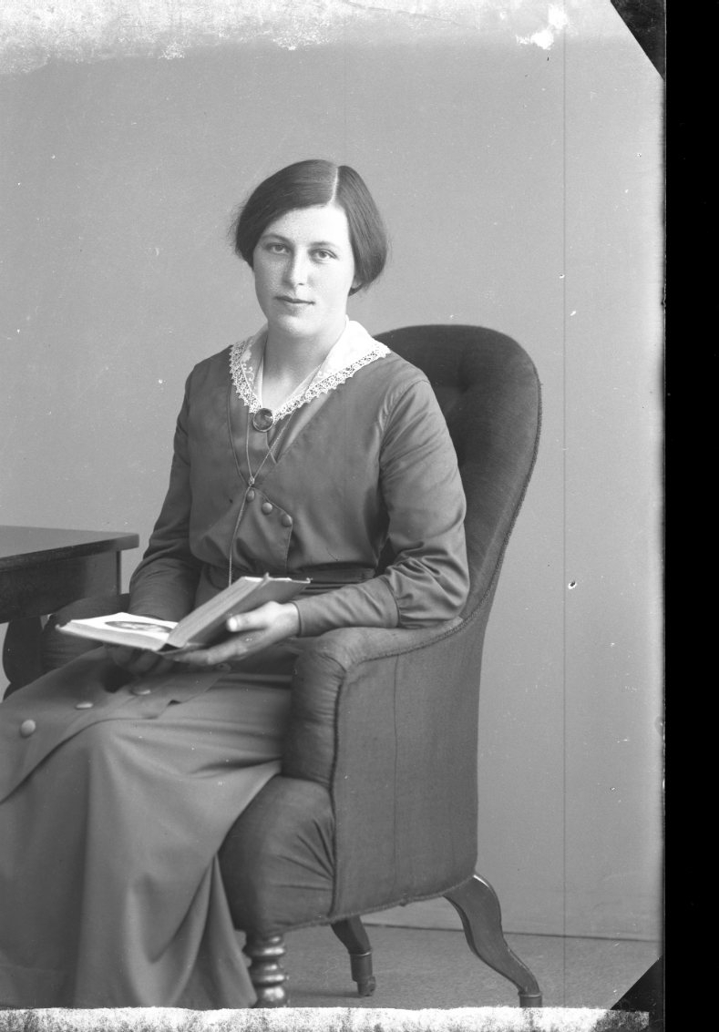 En ung kvinna sitter i en stol med en uppslagen i bok i knät.