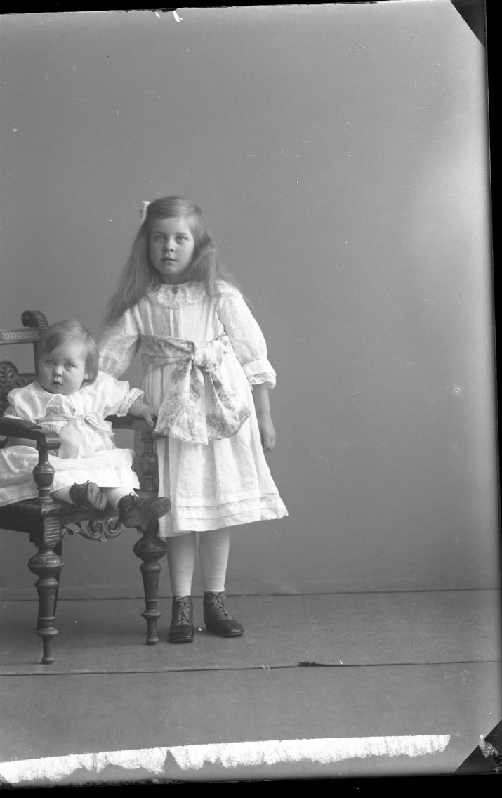 En liten flicka sitter står intill en stol där det sitter ett yngre barn.