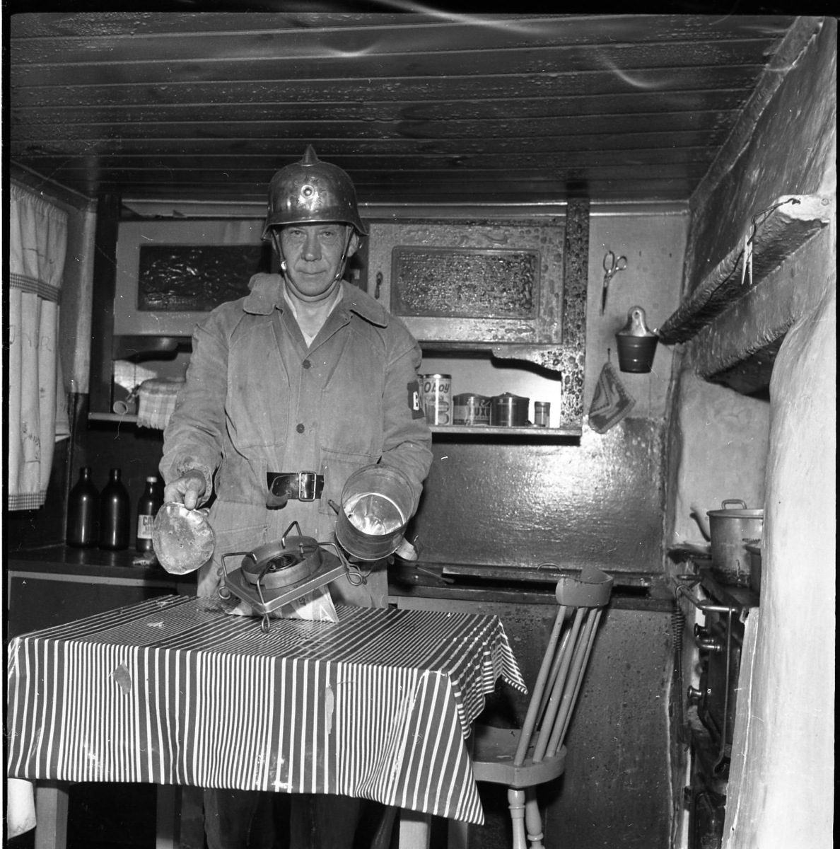 En brandman står och håller i ett metallföremål, i ett kök med järnspis till höger. Det ser ut som att han förevisar en platta till en gasspis. Det ser ut som att det har brunnit i rummet han befinner sig i. Färgen på väggen bakom honom är bubblig.