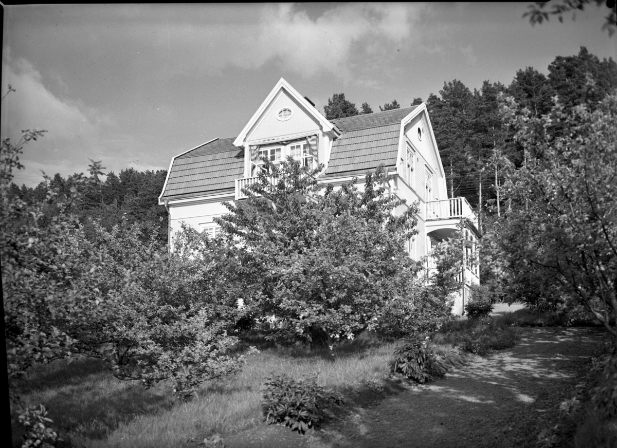 En villa med frontespis och ljus träfasad, omväxlade liggande/stående panel. Balkong mot väster söder, fotograferad från baksidan.