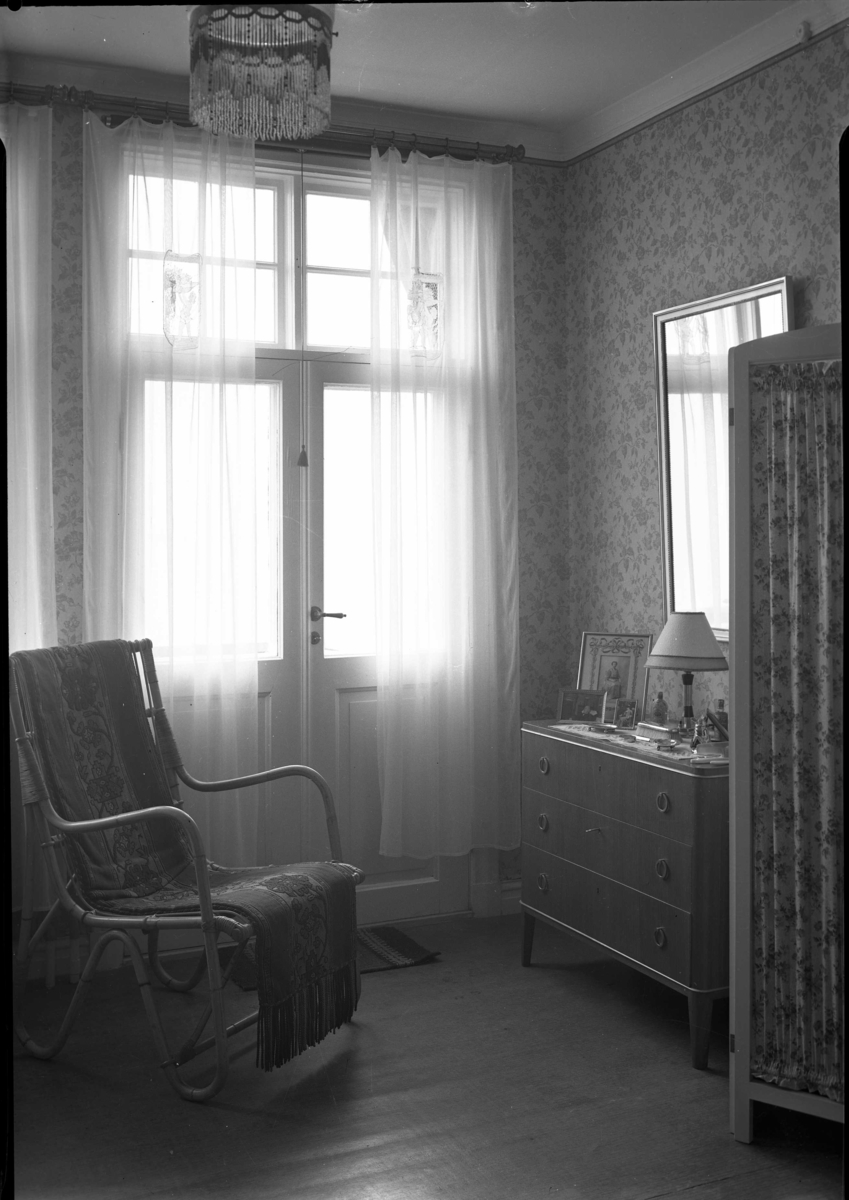 Interiör från en villa. Ett rum som sannolikt vetter mot en balkong. En stol och byrå.