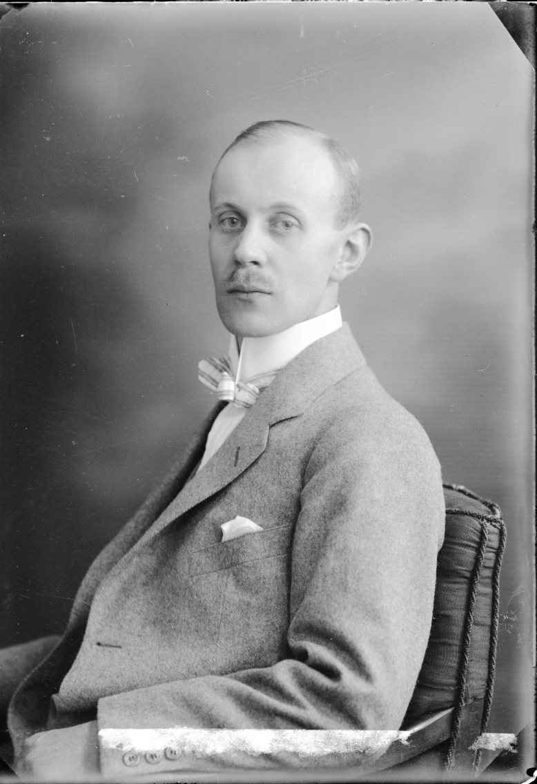 Bröstbild av en ung tunnhårig man med mustasch. Han sitter på en stol.