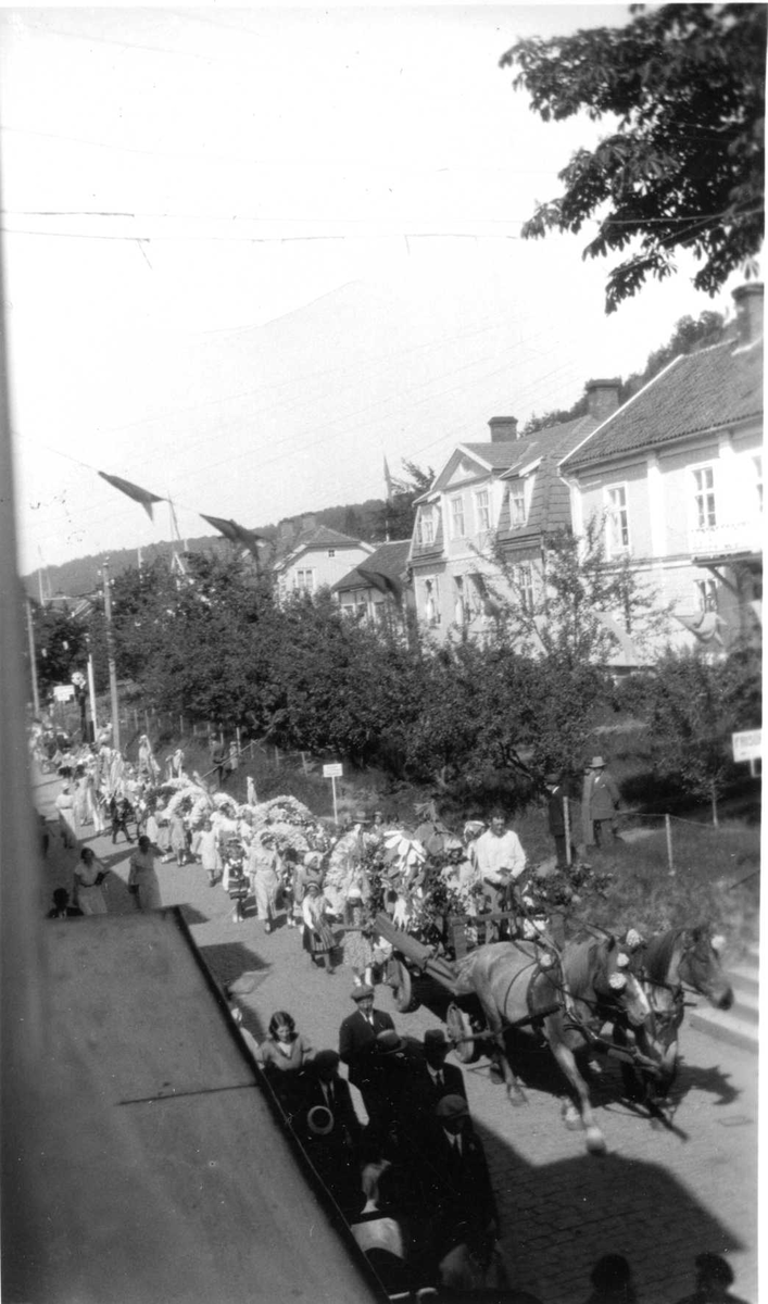 Kortege med häst och flakvagn före barn/ungdomar med blomsterbågar på Brahegatan i Gränna.