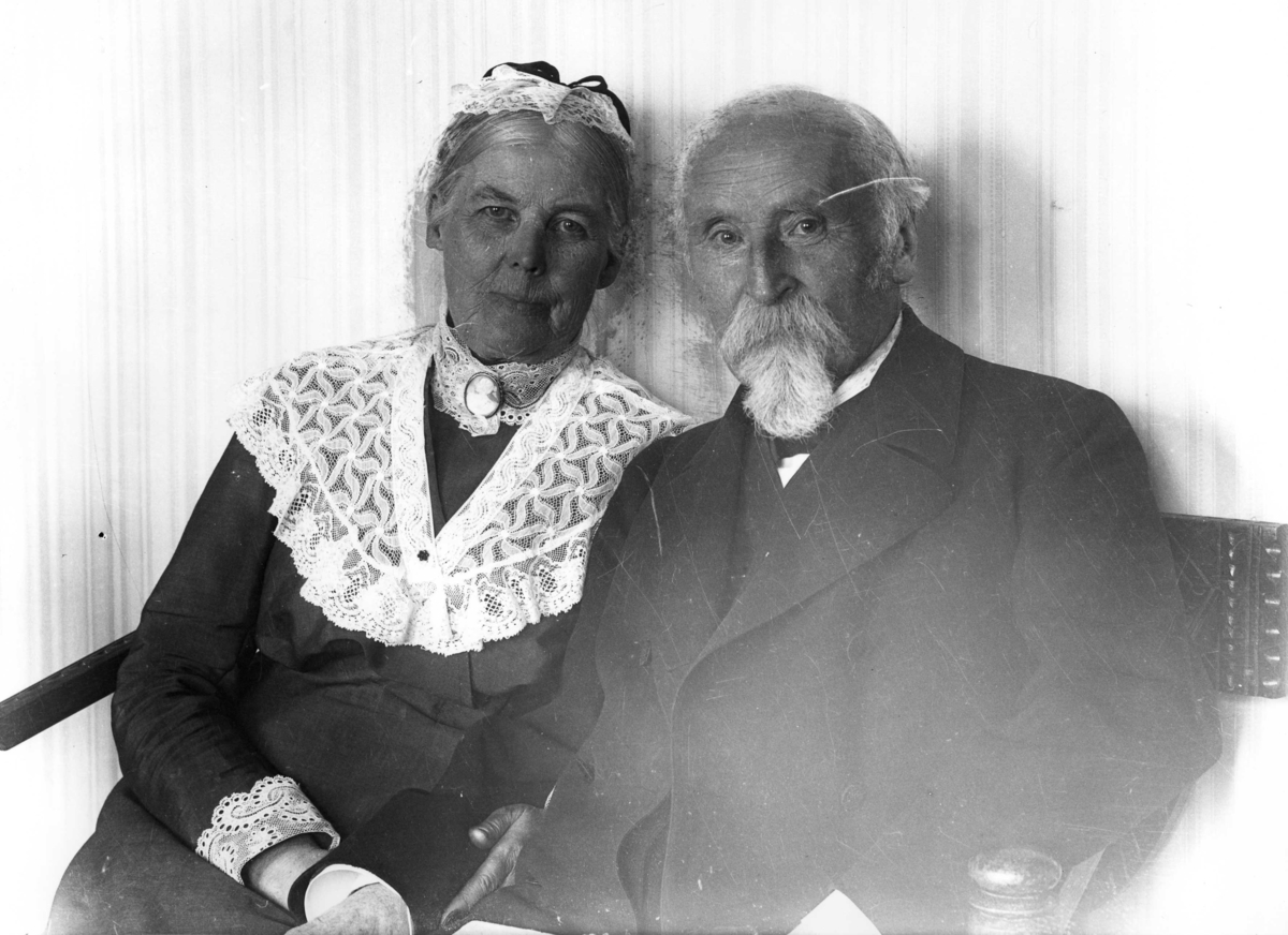 Doktor Stolpe med hustru. Hustrun Eva sitter med maken Mats i en soffa/stol. Hon har en vid spetskrage över sin klänning