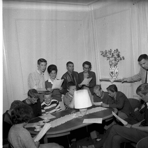 En samling med männiksor sitter runt ett bord och sjunger tillsammans. Alla har blivit tilldelade ett texthäfte.