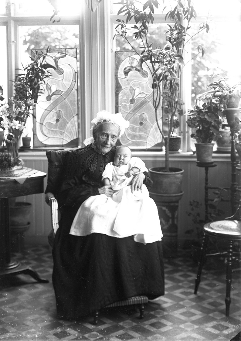 Porträtt av en äldre kvinna med ett spädbarn i knät, i hemmiljö.