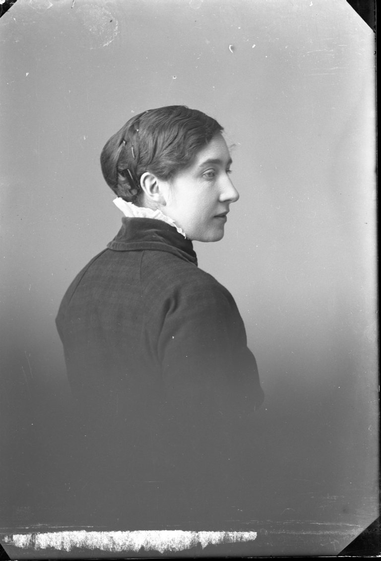 Porträtt av en kvinna, snett bakifrån med huvudet i profil.