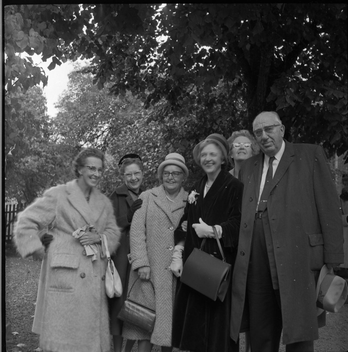 Rotarydamer på Grännabesök 1961. Flera kvinnor och en äldre herre iklädda rockar står och poserar framför kameran för fototgrafering.