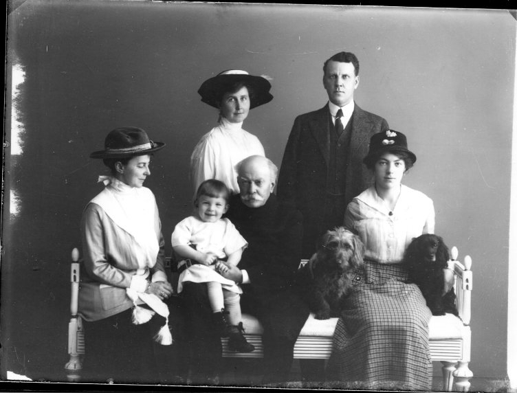 En äldre man sitter i en soffa med en liten pojke i knät, en kvinna med hatt på vardera sidan. Kvinnan till höger har i sin tur en hund på bägge sidor om sig. Bakom dem står ytterligare en kvinna med hatt samt en man.