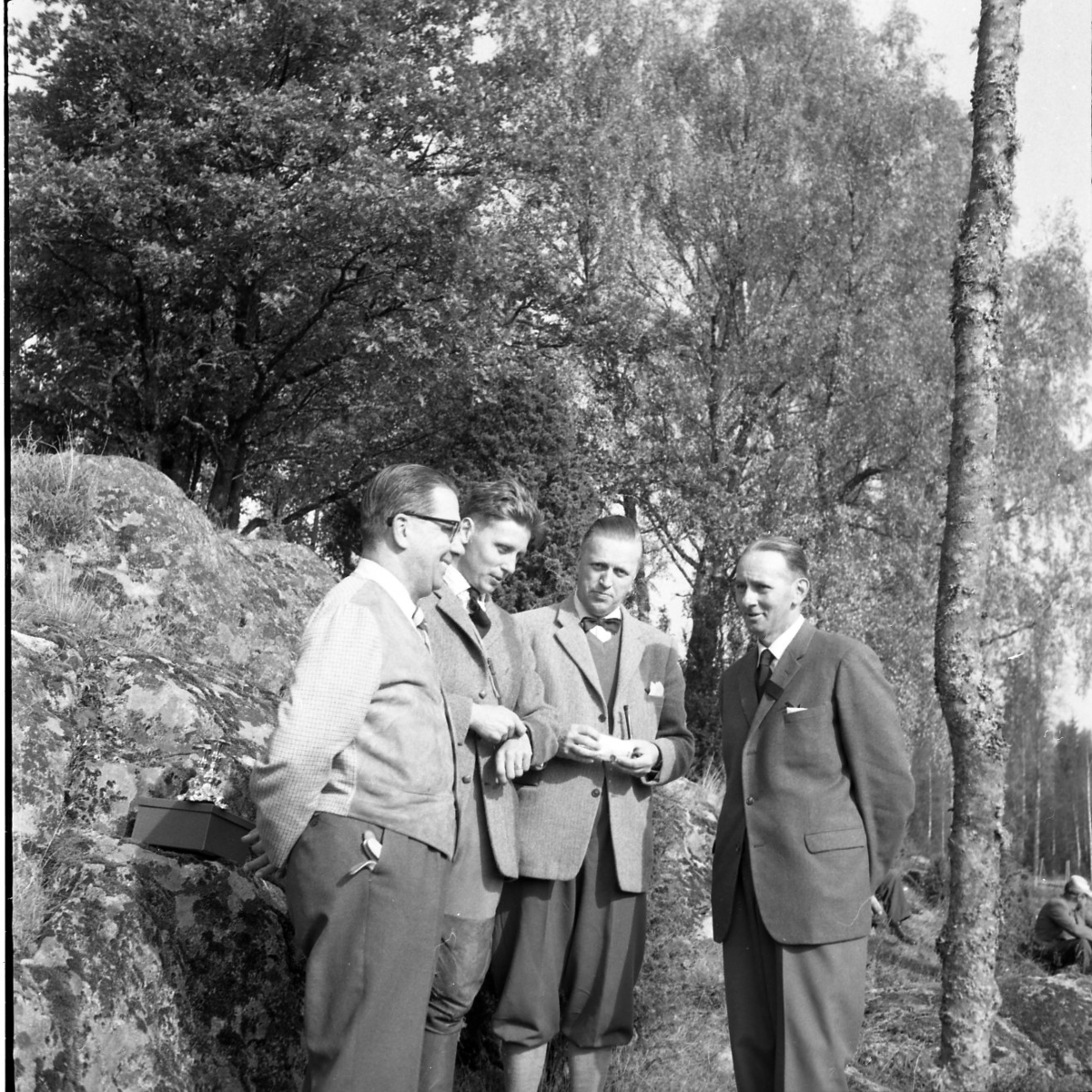Fyra män står axel mot axel och pratar. De bär kavaj och slips. En man håller på att stoppa en pipa.