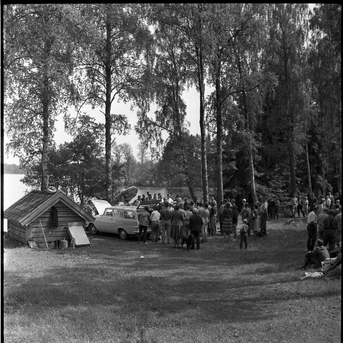 Folksamling vid en strand med höga björkar. En liten timrad bod till vänster och möjligen en Forg Anglia herrgårdsvagn med uppfälld motorhuv och bagagelucka.