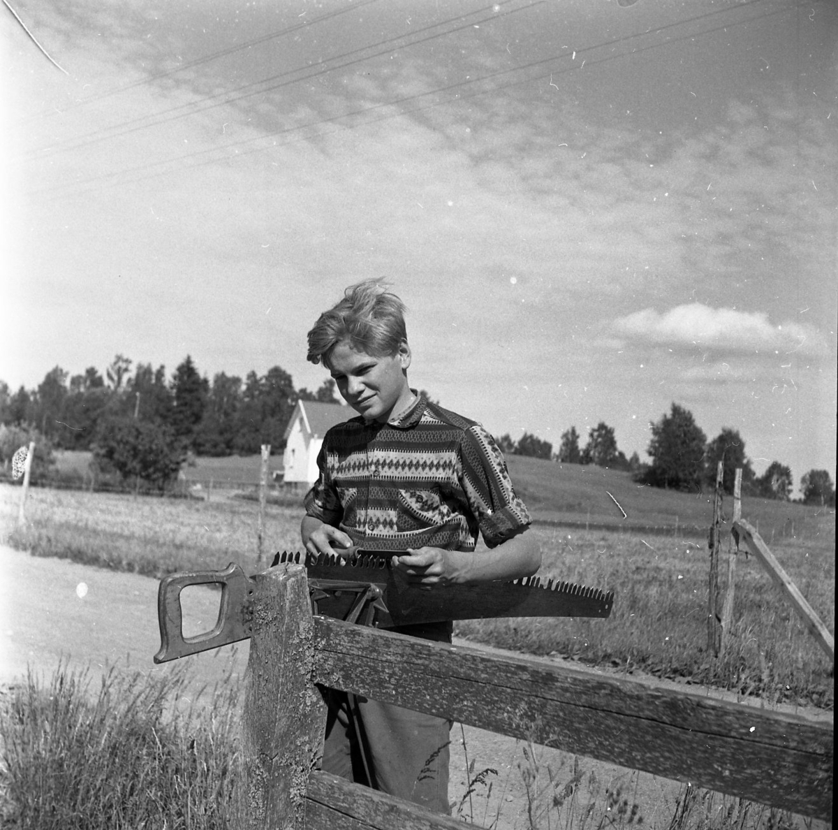 Titel: En ung man står och filar på en såg som har väldigt grova tänder. Sågen är fastsatt vid ett staket.