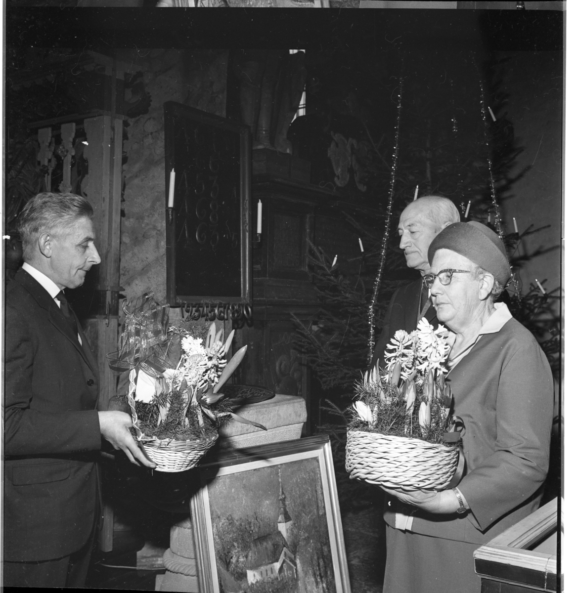 Tillträdande kyrkvärden David Linder i Brahekyrkan håller en julgrupp. Till höger står en oidentifierad äldre kvinna med en julgrupp i famnen. Bakom henne står avgående kyrkvaktmästaren Ture Johansson. De befinner sig i Brahekyrkan där det också står en julgran i bakgrunden.