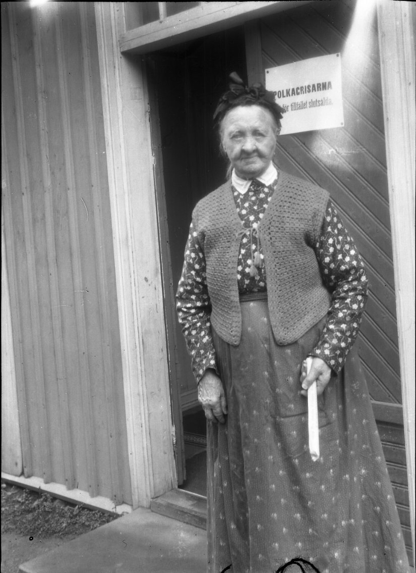 Sockerbagaren Amalia Erikson står i en dörröppning med en polkagris i vänster hand. Hon bär en blommönstrad klänning, armlös genombruten kofta och långt förkläde. På väggen bakom henne sitter en skylt med texten: "Polkagrisarna ... för tillfället slutsålda".