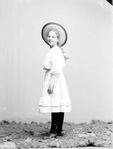 Porträtt av en flicka i ljus klänning och med stor hatt på huvudet.