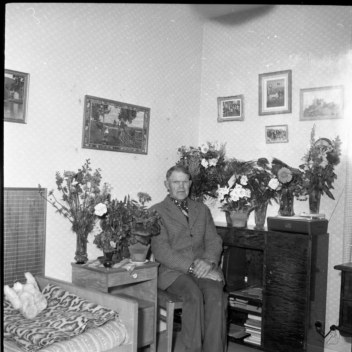 En man sitter i en hemmiljö. Han är omgiven av blommor. De hänger tavlor på väggarna.